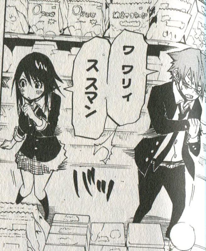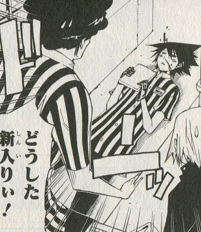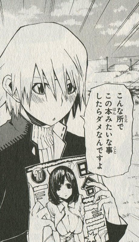 少年の傍らに現れる無壊。無壊にエロ本「田舎」を渡す少年。ふところにしまう無壊。