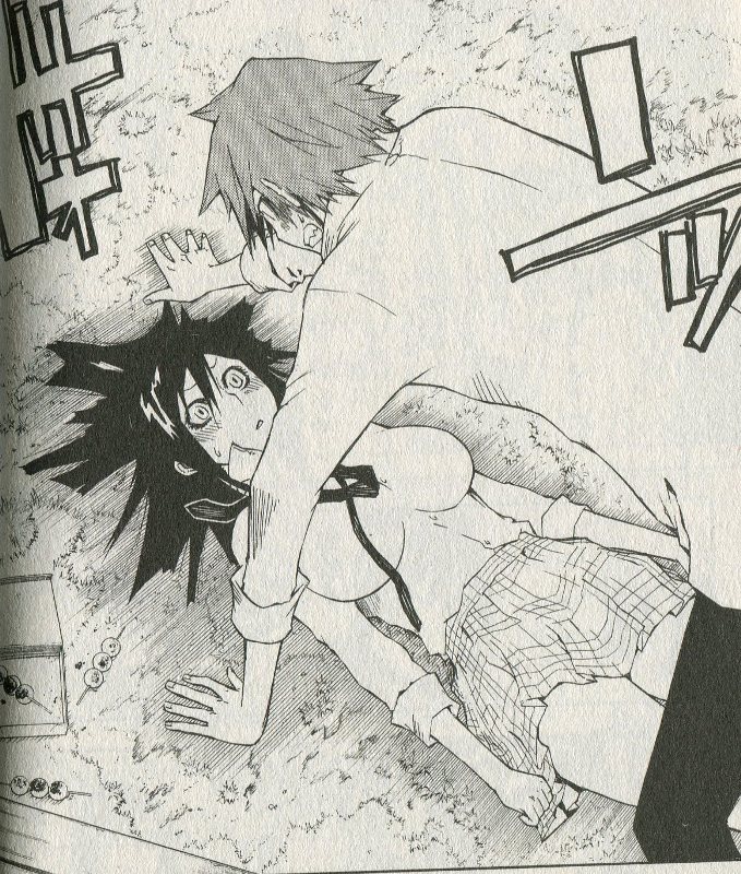 団子落とす→あわてて地面に着く前に拾おうとする二人