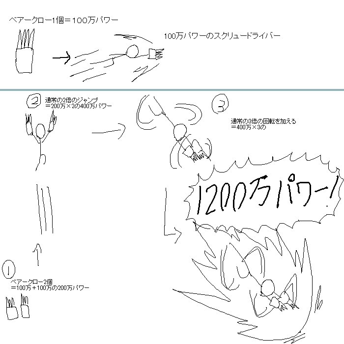 彼の必殺技にはスクリュードライバーという、回転しながらベア―クローで相手を惨殺する